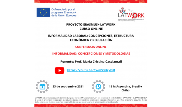 On Thursday, September 23 of this year, the first seminar "Informality: conceptions and methodologies" by Professor María Cristina Cacciamali was realized. This seminar was held within the framework of the conclution of Module 1 with the same name, of the LATWORK Virtual Course "Labor Informality: Conceptions, Economic Structure and Regulation".