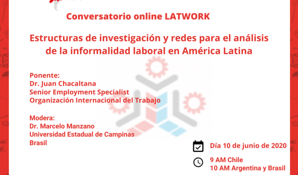 En el marco de la ejecución del proyecto Erasmus+ LATWORK el día 10 de junio a las 9 horas (Chile), 10 horas (Brasil y Argentina) se desarrollará el Conversatorio Online LATWORK: Estructuras de investigación y redes para el análisis de la informalidad laboral en América Latina. Este conversatorio está organizado conjuntamente entre la Universidad Viña del Mar, Chile, la Universidad Estadual de Campinas, Brasil y la Universidad de Buenos Aires, Argentina.