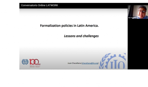 Seguidamente, el Dr. Marcelo Manzano, académico de la Universidad Estadual de Campinas, presentó el ponente Dr. Juan Chacaltana, Senior Employment Specialist de la Organización Internacional del Trabajo, quién desarrolló una ponencia bajo la temática “Políticas de Formalización en América Latina”. Esta presentación versó sobre aprendizajes y desafíos a futuros para la investigación en relación a la informalidad laboral y en particular en el tema de las políticas de formalización en la región de América Latina. En distintas instancias de la presentación, el Dr. Chacaltana, utilizó la perspectiva comparada entre América Latina, Asia y África. En este sentido, y indicado como un desafío en el contexto actual afectado por la crisis del COVID-19, también se apuntó que los trabajadores de la economía informal están siendo desproporcionalmente afectados por esta situación debido a las restricciones de movilidad o confinamiento y por la distinta capacidad de respuesta de los estados ante este tema.