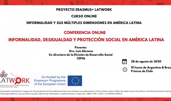 In the framework of the LATWORK project, on August 28th 2020 at 9 o'clock (Chile) and 10 o'clock (Argentina & Brazil) the Online Conference "Informality, Inequality and Social Protection in Latin-America" will take place. The keynote speaker of this Conference is Laís Abramo, PhD, ex-director of the División de Desarrollo Social of CEPAL. This conference is organized in the framework of LATWORK Online Course "Informality and its multiple dimensions in Latin-America", specificaly as the closing of the Second Module of the Course "Informal Work in Latin-America", which has taken place this August. The Conference will be open to the public and shared live through the Youtube Channel of LATWORK Project. If you are interested in this activity and would like to register you can do so in the following link:l Formulario de Registro de la Actividad.
