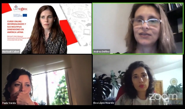 The webinar began with the words of Ms. Meritxell Calbet, Director of International Cooperation in Universidad Viña del Mar and General Coordinator of the LATWORK Project, who welcomed the participants and presented de course. After that, Dr. Andrea Delfino, academic at Universidad Nacional del Litoral, Argentina, and one of the professors in charge of module 3 of the course, introduced the keynote speakers. The first speaker was Dr. Elva López, Official in Inclusive Labour Market Institutions, ILO Country Office for Argentina, who gave the conference “Informalidad tiene rostro de mujer”. The second conference Informalidade e as relações de classe, de gênero de raça was developed by Dr. Angela María Carneiro Araújo, Professor and Researcher at Universidade Estadual de Campinas, Brazil. These conferences and in general, the whole third module of the course, had the aim of addressing the informal labour market as a focus of inequalities, especially inequalities related to dynamics like gender and race, which are very relevant in this labour market.