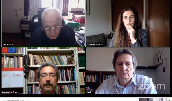 La actividad inició las palabras de la Sra. Meritxell Calbet, Directora de Cooperación Internacional de la Universidad Viña del Mar y coordinadora general del Proyecto Erasmus+ LATWORK, en la que dio la bienvenida a los y las participantes de la actividad y presentó el Proyecto Erasmus+ LATWORK y el Curso Virtual “Informalidad y sus múltiples dimensiones. Posteriormente, el Dr. Roberto Veras, de la Universidad Federal da Paraíba, Brasil, uno de los profesores responsables del Módulo 1 del Curso Virtual LATWORK “Informalidad y sus múltiples dimensiones en América Latina", presentó al Dr. Julio César Neffa, investigador Superior del CONICET y profesor universitario. En la ponencia, el Dr. Neffa reflexionó sobre las concepciones y debates que han marcado la historia del concepto de informalidad laboral hasta la actualidad.